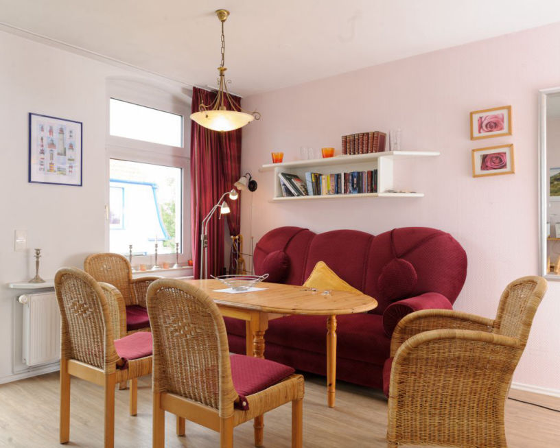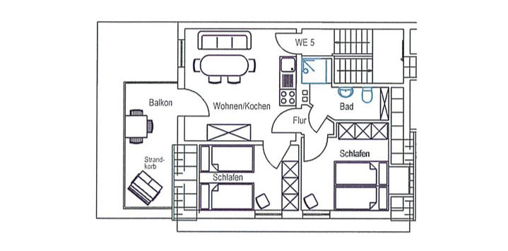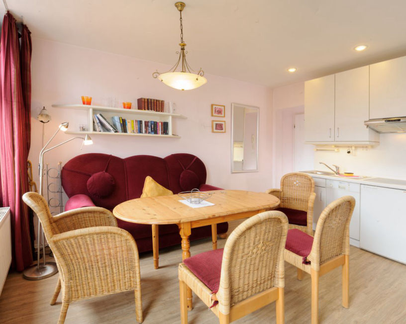 Mikrowelle-Heißluft-Kombination, Geschirrspüler, Kühlschrank mit Eisfach, Toaster, Wasserkocher, Kaffeemaschine, Mixer, Kabel-TV, Fernseher, DVD-Gerät, Musikanlage, CD-Player und Radio
